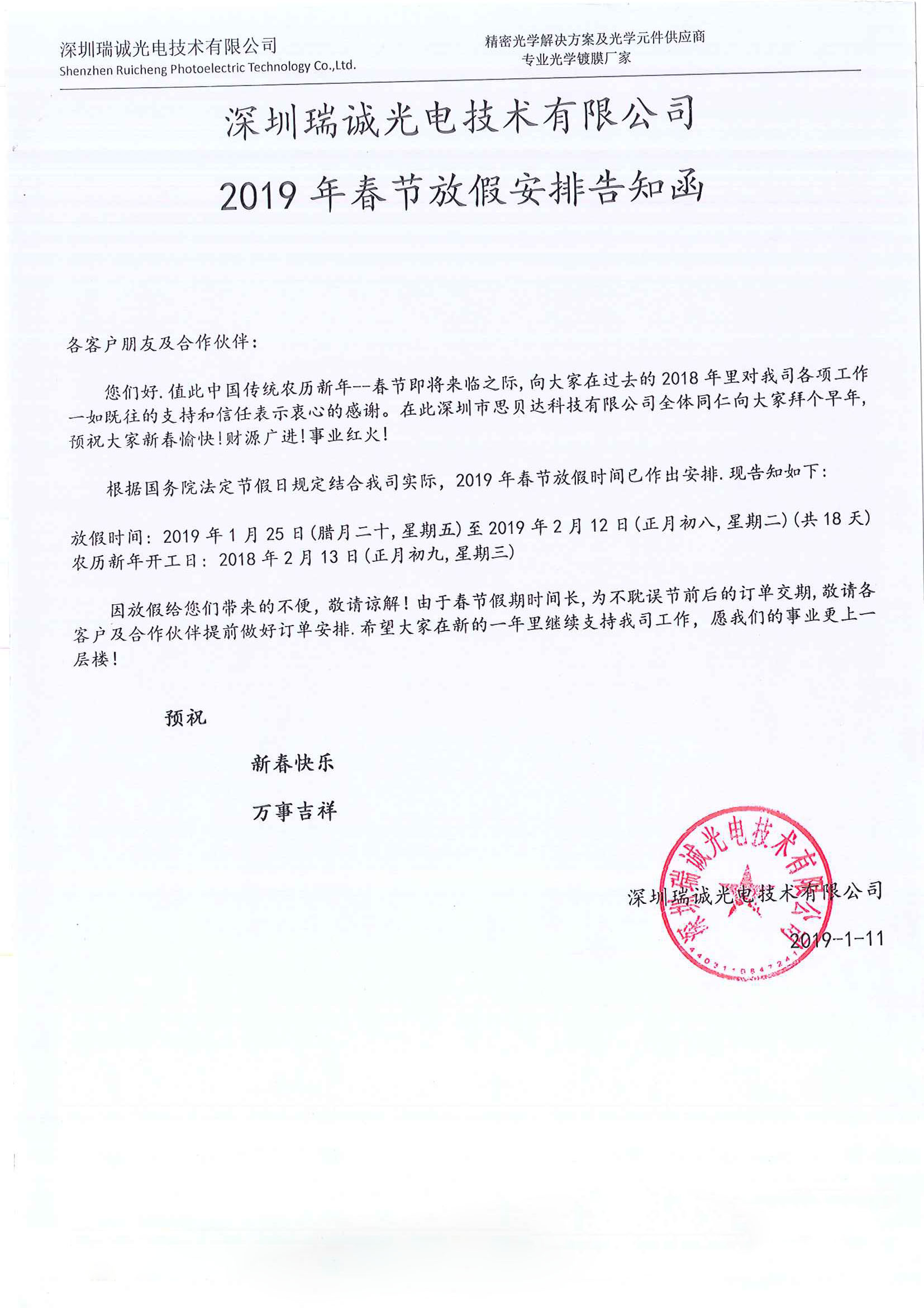 瑞誠光電2019春節(jié)放假通知