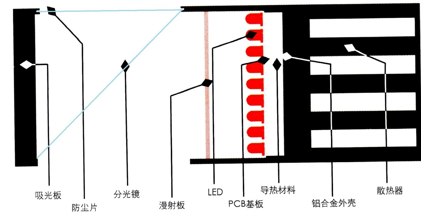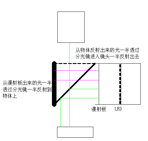 如圖所示,LED的光來到這樣的45度半透半反玻璃,一半的光直接穿過小孔洞照射到左側壁上,這部分光不會進入攝像頭,對成像沒有影響;另一半光經(jīng)鏡面反射射到下面的物體上.從物體上反射上來的光來到45度半透半反玻璃后,又是一半光直接穿過小孔洞照射到上頭的攝像頭上,這部分光是成像要用的;另一半光反射回右側的LED燈,這部分光對成像也沒影響.如果下面的被測物體換成水平放置的普通鏡面,那么從LED出來的光最終只有1/4能到達攝像頭!想要圖像清晰,就要付出光亮上的代價!所以,LED光源要比普通光源亮4倍,才能保證拍攝的圖像有同等的亮度。