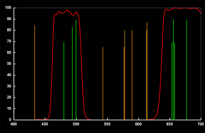 濾光片在攝影和天文觀測中一般叫做濾光鏡,簡稱為濾鏡,UHC濾光片是英文Ultra High Contrast Filters的縮寫,屬于天文濾鏡系列中的寬帶濾鏡。UHC有選擇的阻擋某些有害波長的光,特別是人造光(包括汞光、鈉光)以及自然中天空輝光(skyglow),讓星云發(fā)出的有用光高效透過,該濾鏡在OIII(496nm和500nm)、Hβ(486nm)、NII(654nm和658nm)、Ha(656nm)和SII(672nm)頻段附近的透過率極高,有效阻止(0.1%)了城市高壓Na(589nm)Hg(578nm)的等波段有害光,有選擇的濾除城市有害光而透過星云的發(fā)射譜線,有效提高星云的對比度,注意不是亮度,從而再現(xiàn)豐富的星云細節(jié)。
