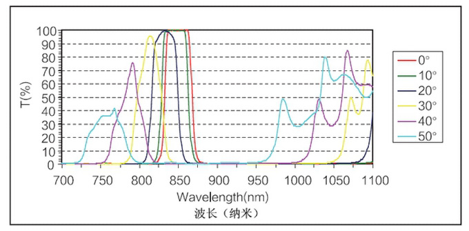 只要使用干涉濾波器,就不能避免角效應,這是干涉濾波器的基本特性。從圖中可以看出,當在50°處使用850納米的窄帶濾波器時,它不再是850 nm的窄帶濾波器,而是約760納米的窄帶濾波器。這也是用戶經(jīng)常需要在CCD和透鏡之間放置濾光片的原因,因為CCD之前的光線發(fā)散角不太大,通常小于12度,當放置在透鏡前面時,當面對物體時,濾光片接收到一個較大的角度。在大角度范圍內(nèi)沒有干涉光。