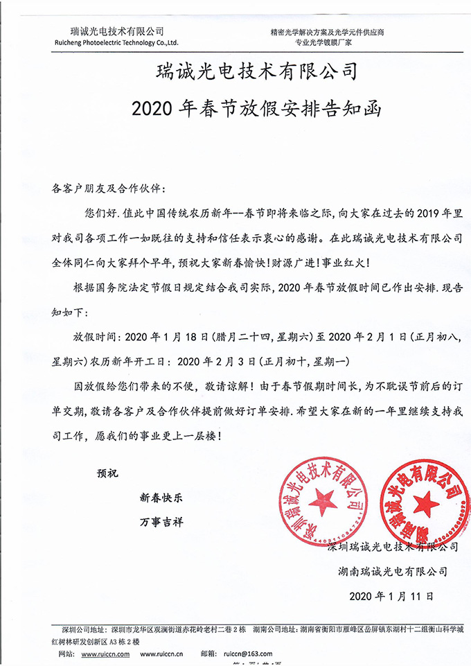 各位瑞誠光電的員工及尊敬的客戶們,以下是我公司2020年春節(jié)放假安排內(nèi)容,請知悉: